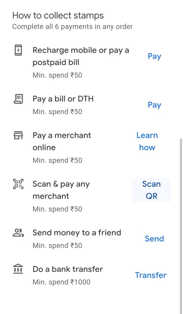 | 5 | Send money to a friend โ min. spend โน50 |